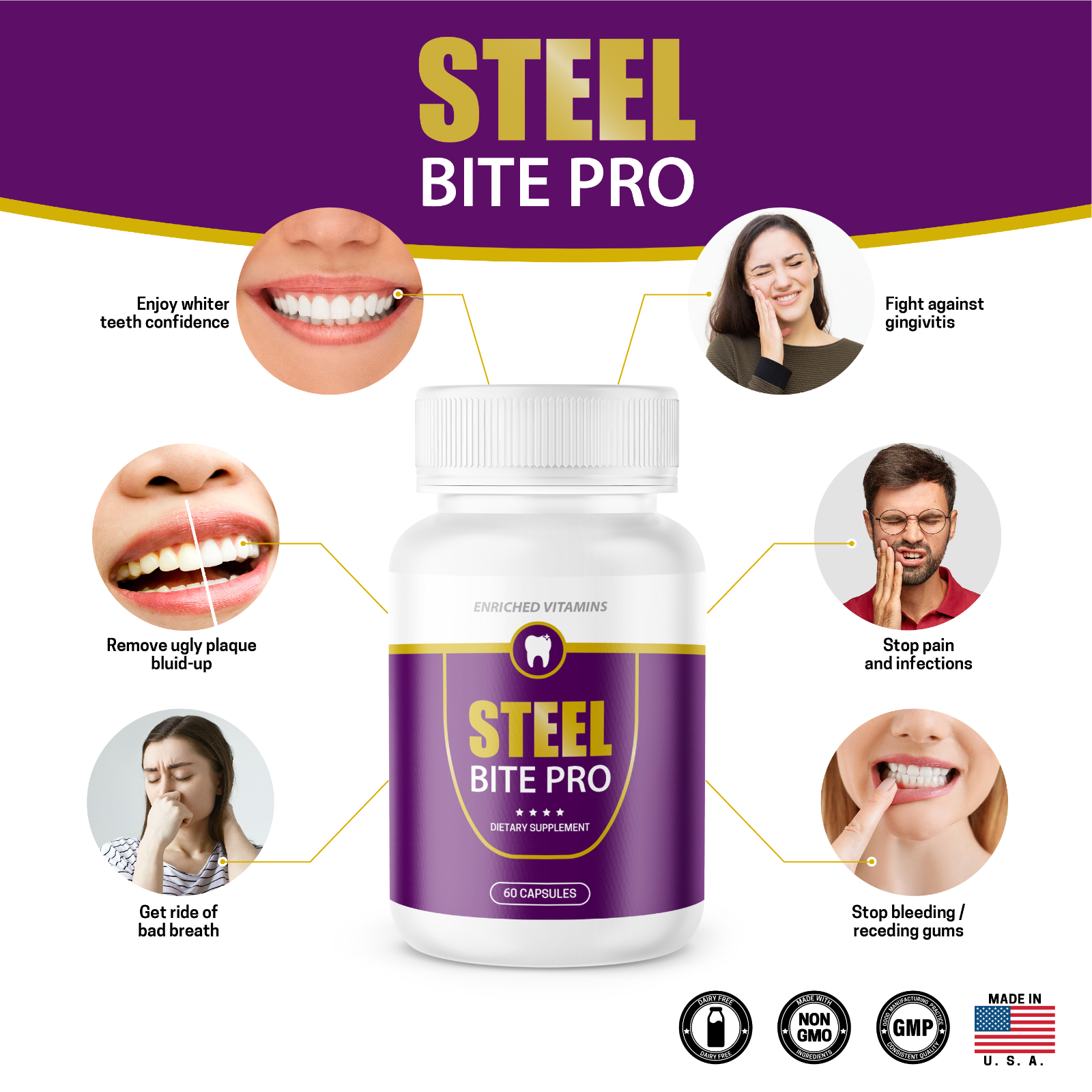 Steel Bite Pro is a dental health treatment that asserts its effectiveness in addressing various dental issues. Formulated with natural ingredients scientifically proven to support and enhance oral health, this supplement offers comprehensive protection against problems such as weak enamel, bleeding gums, bad breath, tooth decay, and cavities.